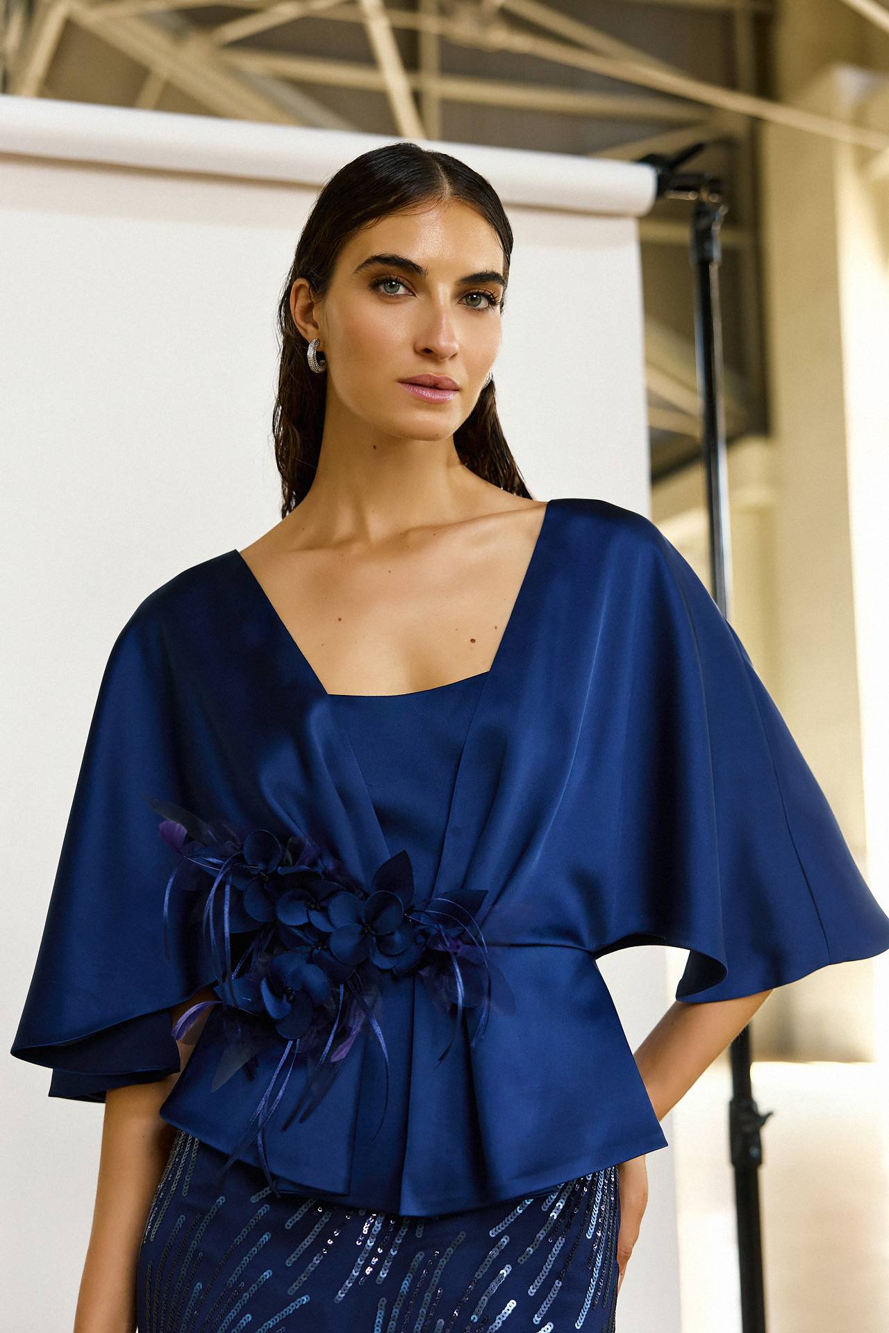 Le haut est en satin fluide, marquée à la taille avec des demi-manches amples. Ce haut couvre les bras et les épaules avec élégance.