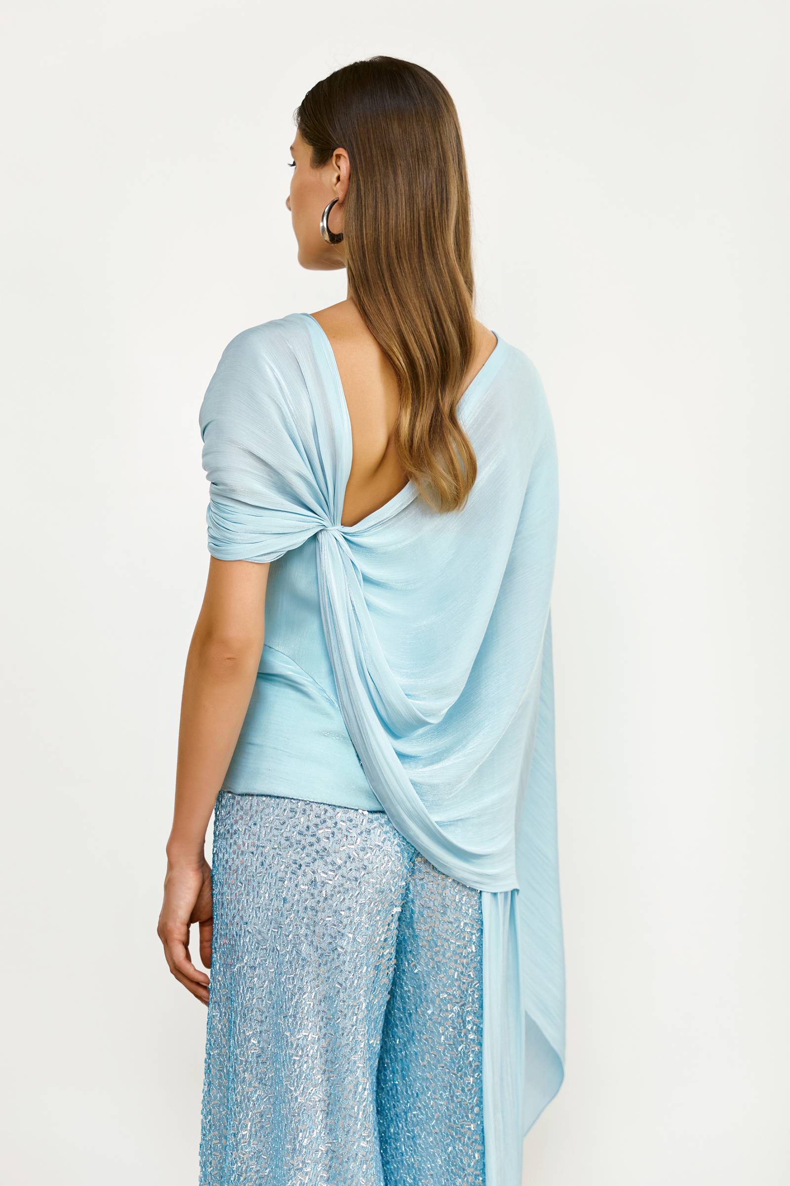 Le haut est confectionné en satin et en mousseline. Il est asymétrique, avec un joli pan en mousseline sur une épaule. La matière est douce et agréable à porter.