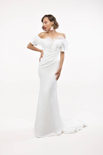 La robe de soirée sirène couture a un décolleté bateau garni de 3 volants en ORGANZA et de petites manches qui couvrent le haut de vos bras. La robe de soirée couture est confectionnée dans un tissu extensible et gainant. La robe est drapée au niveau du ventre pour le dissimuler et donner un effet taille de guêpe.