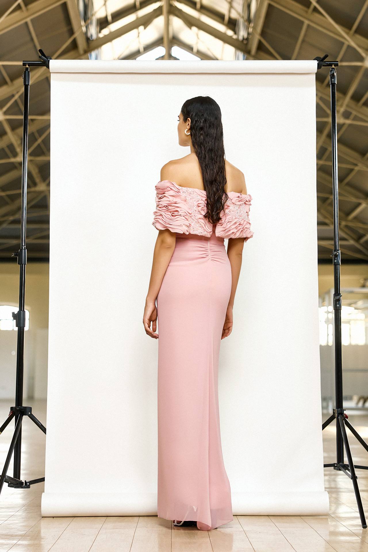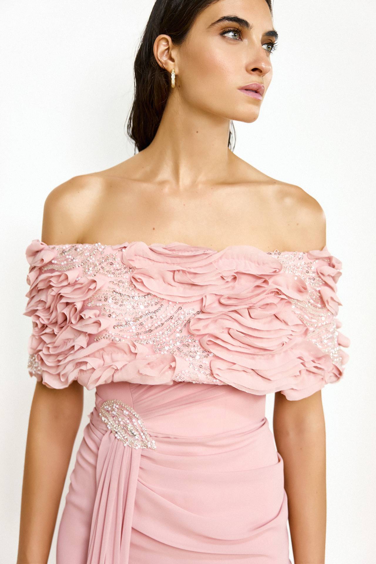 La robe sirène est marquée à la taille par un bijou élégant. Sa coupe ajustée dessine une ligne élancée.
