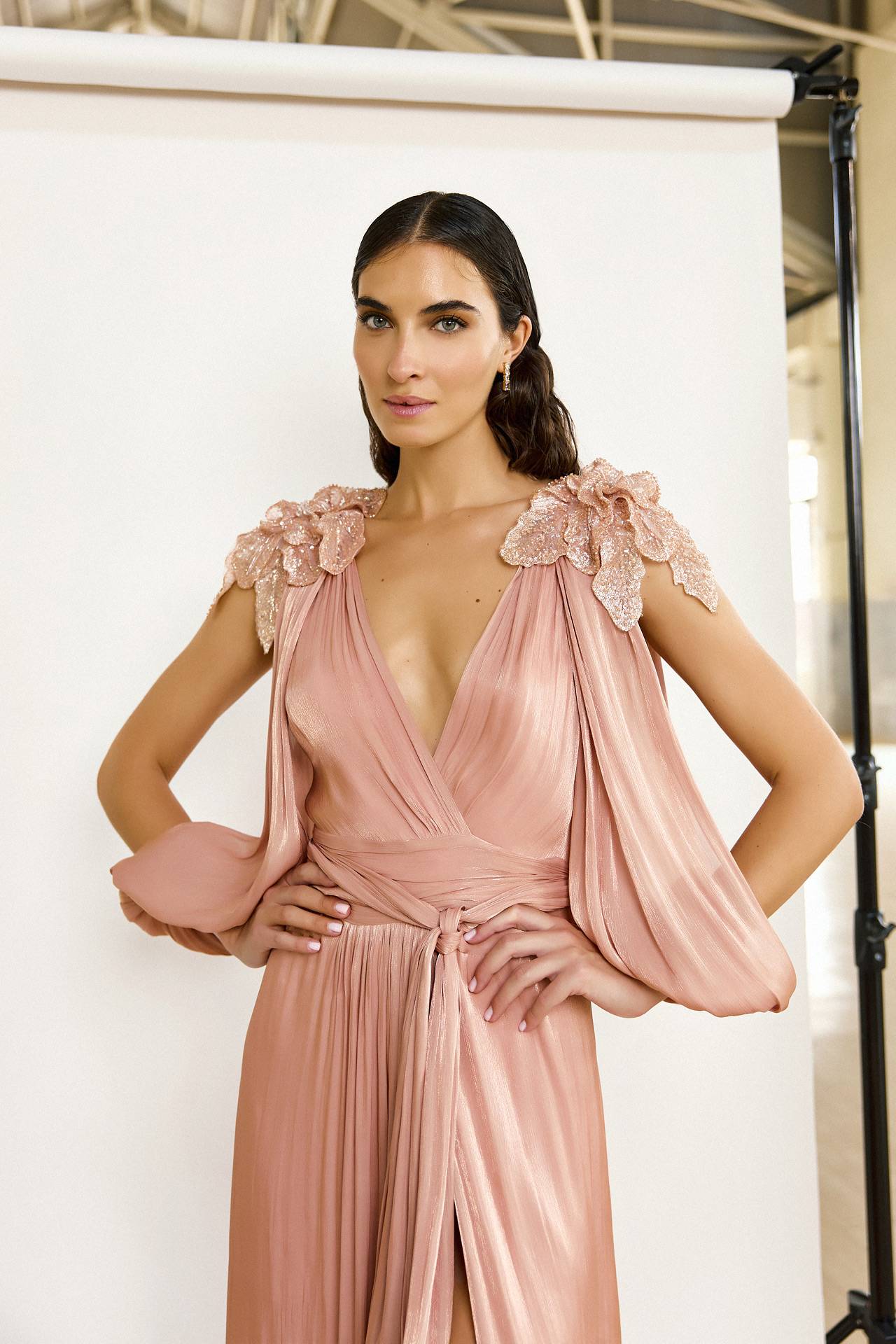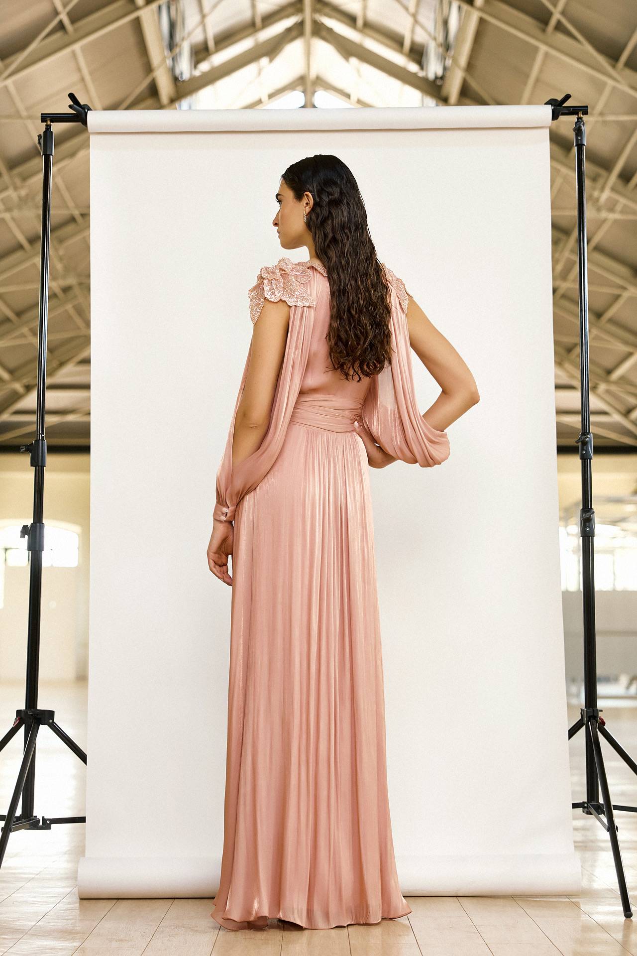 Les manches drapées et tombantes habillent les bras avec légèreté et apportent de la fluidité.