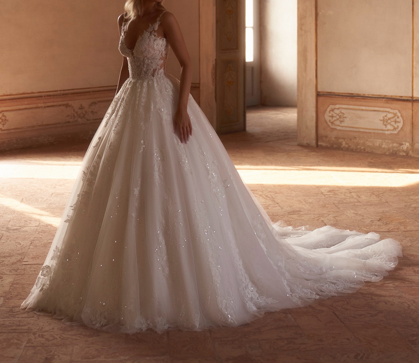 Vous allez vous marier en 2026 et vous souhaitez porter une robe de mariée sirène tendance avec des fines bretelles, un dos nu et une magnifique traîne spectaculaire en dentelle très longue ?  Venez essayer les plus belles robes de la collection mariée Anna Sposa 2026, entièrement faites à la mai...