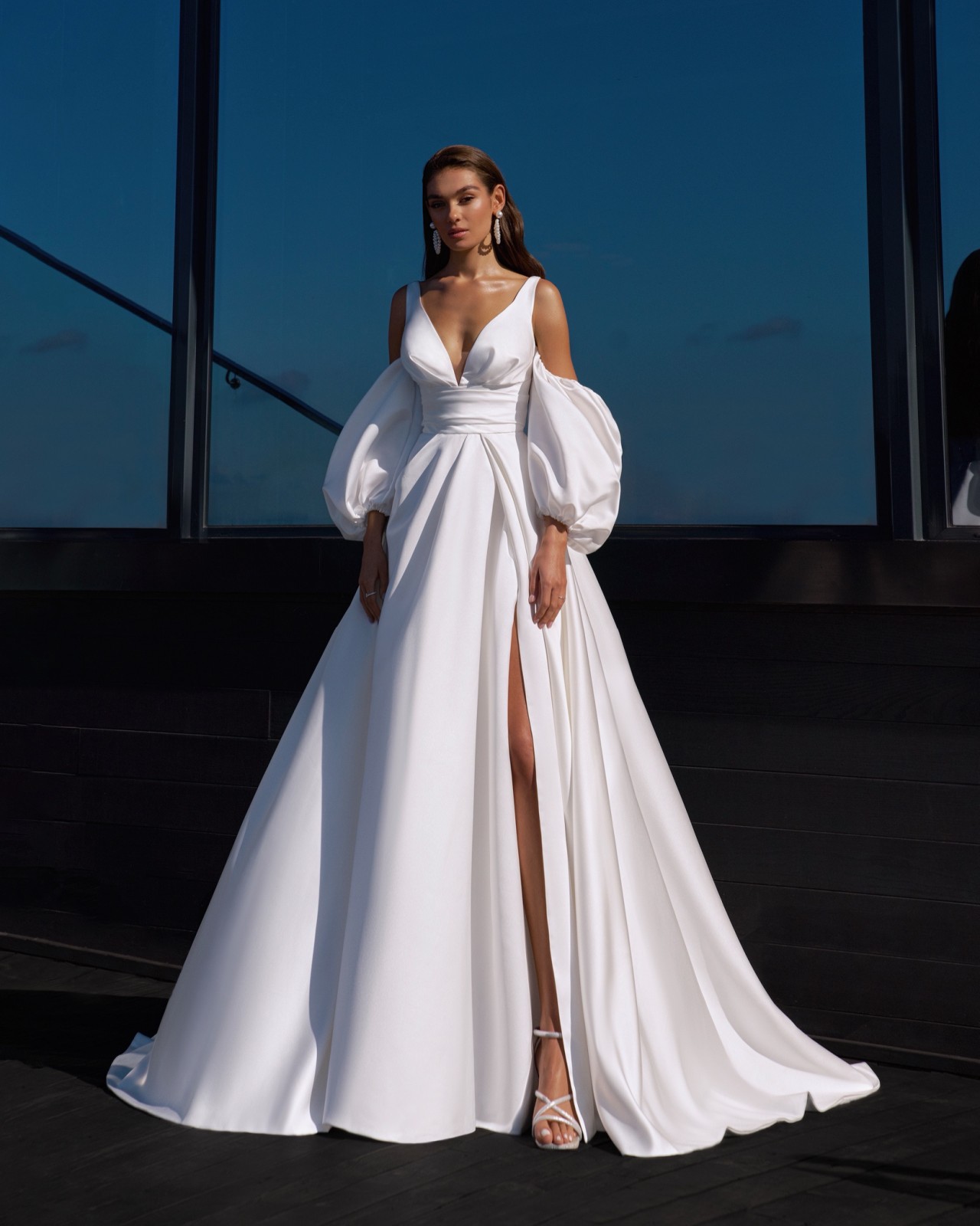 Découvrir la robe de mariée KOBEYA en forme de A en satin mikado, décolleté en V, avec ceinture à la taille, manchons bouffants et laçage dans le dos, haut de gamme à Marseille