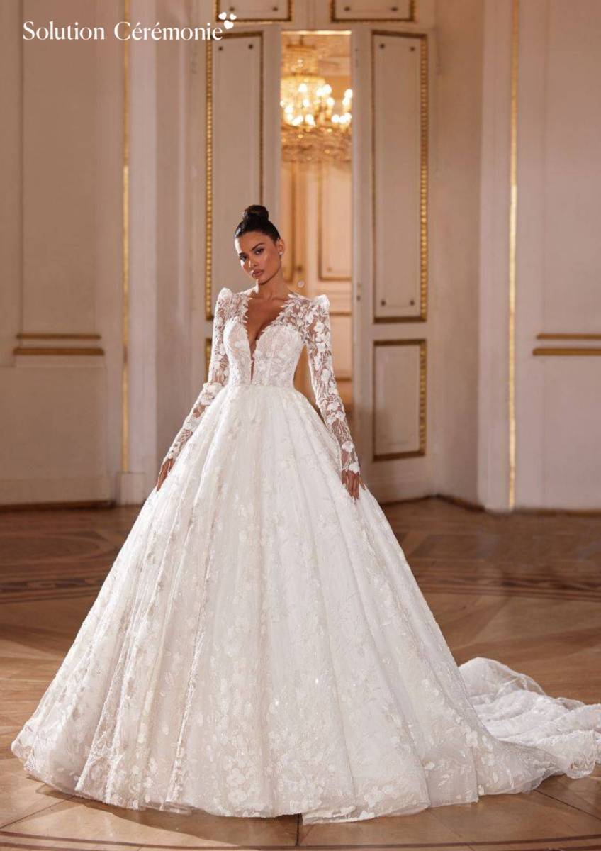 Acheter une sublime robe de mariée princesse LANCORA décolleté en V plongeant avec épaulettes et manches longues à la Boutique Solution Cérémonie dans le 1e arrondissement de Marseille.
